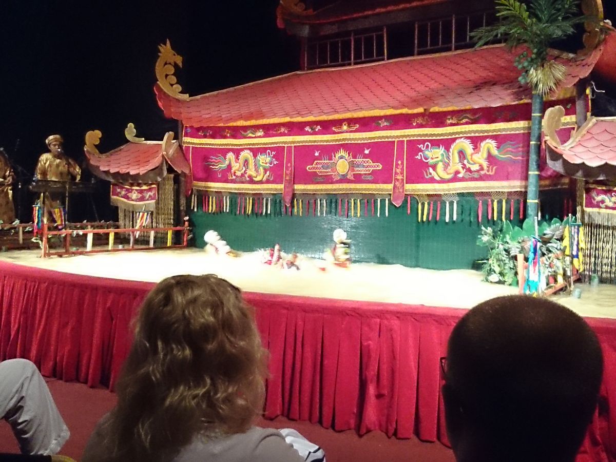 水上人形劇は45分間のうちプログラムが14個あり、伝統民族音楽に合わせて牛に乗った人間や竜、カエル、獅子舞たちがテンポ良く息のあった動きをし、私たちを楽しませてくれました。人形たちの台詞はベトナム語だったのですが、笛や琴の生演奏や雨を降らせるなどの演出が素晴らしかったので言葉はわからなくても十分に物語を掴むことができました。また、人形たちの衣装がどれも色鮮やかだったことが大変印象に残っています。ひな壇のようになっている席の4列目くらいまでお客さんがいたのですが、いろいろな国の人がおり、劇中に写真を撮っている人もたくさんいました。