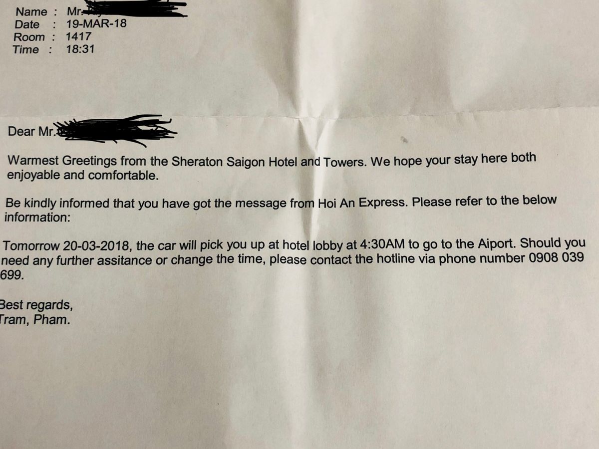 到着日はホテル変更したのに上手く通じていなくて違うホテルに行っちゃいまして、帰りが少し心配してましたが朝、予定通りにロビーでお会いできそのまま空港に、しかし、国内線のVN便が遅れておりがっかり、、仕方なく、現地送迎会社に電話してハノイのピックアップ時間を変更して無事フライト、ハノイでもスムーズなピックアップで良かったです。