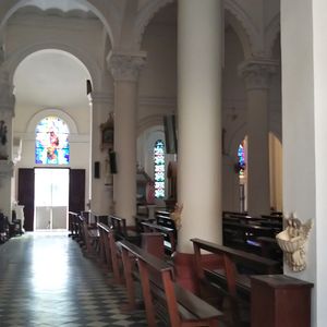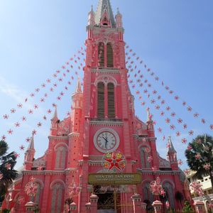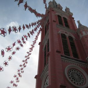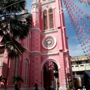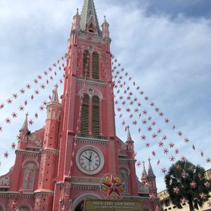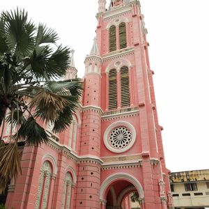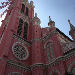 その後、このツアーならではの、ピンクの教会(タンディン教会)に行きました。この教会はインスタ映えということで人気が出すぎて内部の見学が禁止になってしまったということで、内部は窓からのぞくだけでした。でも、ステンドグラスなどは良く見えるので綺麗でした。写真を撮る時間も十分とっていただいたので、サイゴン大教会の代わりに楽しめました。