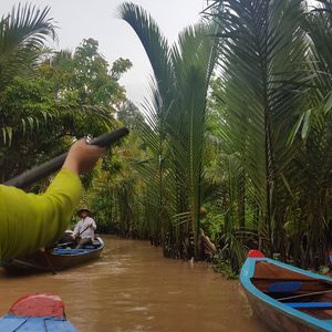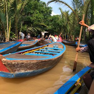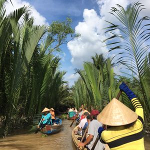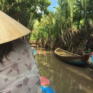 その後またジャングルのような小道を歩いて、小舟に乗る場所へ。メインイベントとも言える手こぎボートくだりです。ベトナムの帽子をかぶってまさにインスタジェニックというところですが、私はかなりバテバテ。意外とこの手こぎボートクルーズの時間は短いですが、こんなものでしょう。