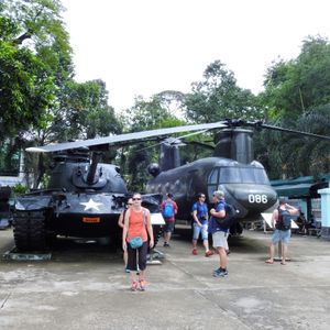 ホテルピックアップ後、旅行会社近くでバスを乗り換え、英語組と一緒のバスで行動。日本語ガイドは若いお兄ちゃんだったが、日本語がいまいちでバスの中では英語ガイドの説明を聞いていた。この日は土曜日でホーチミン市内の渋滞が酷く、現地に遅れて到着。まずはビデオでの説明を見るが、この間に天気が急変して大雨に。傘をバスの中に置いてきてしまったが、取りに戻ることも出来ず、慌ててトンネルに入る。一緒に回った日本人がやや体格のいい方でトンネルの通り抜けに非常に苦労していた。とにかく外が大雨なのでトンネルとトンネルの間はお急ぎで移動。まるで雨宿りでトンネルに入るような感じ。ここでのガイドの説明はまずまずでみんなが無事トンネルを通れるか気遣いながらの案内。最後のトンネルを出たところでこの体格のいい方が慣れない無理な姿勢を続けていてからか体調が悪くなり動けなくなる。一時的に酸欠状態になったようで、しばらく休んだ後、ガイドが医者を呼んできてその人は何とか復活。自分もトンネルの通り抜けには苦労したが、雨でずぶぬれになったこともあって服の汚れを気にせず四つんばいになったので大丈夫だった。体の大きい人は最初から四つんばいで通り抜けするつもりの方がいい。服がドロドロになったので、売店でTシャツを購入して上だけ即着替え。少しさっぱりしてから次の戦争証跡博物館に移動した。総括すると渋滞で現地での時間が少なくなってしまったのと雨でずぶ濡れになったのが残念だったが、なかなか面白い体験が出来たので良しとしよう。