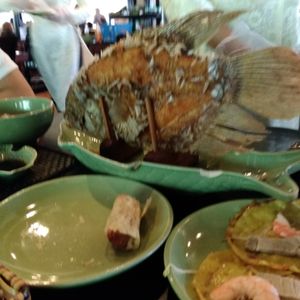 そこからまた2時間ほど移動して、メコン川近くのレストランへ。とても大きいレストランで開放感があります。用意された席で次々に出てくる料理はどれも美味しいので食べ過ぎました。(これが後で困ったことに)それでも食べきれないほどの量です。飲み物だけは各自注文、支払いです。(私はパッションフルーツジュースで300円程度だったと思います)