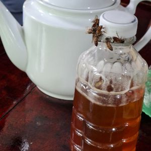 ハチミツとお茶を飲み、蛇を巻いたりして