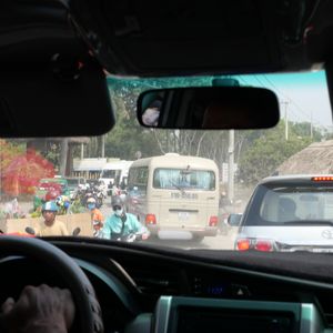 午前8時10分に宿泊していたホテルで待ち合わせ。参加者は我々2人だけで、ゆったりした気分で出発できました。しかし、クチまでの道のりは、春節で田舎に帰る人たちの車で大混雑。通常は1時間半で着くところを3時間半ほどかかり、クチに着いたのは11時半でした。さすがに途中でトイレ休憩を入れてもらい、食堂(?)をしていらっしゃる一般家庭のトイレをお借りしました。これも得がたい経験でした(笑)。