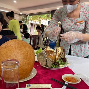 遅めのお昼ご飯はエレファントフィッシュ、餅、白キクラゲのスープ、フォー、プリン。