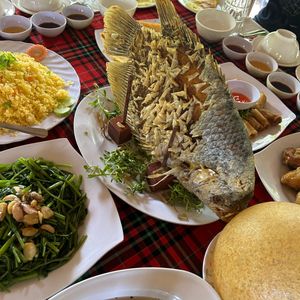 そこで、象耳魚の巨大なお魚のフライと、フォーなどいろんなといただきました。