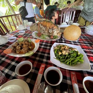 メコン川ツアーの終わり頃に食事をします。大きい揚げ魚と肉料理、野菜、ご飯、スープ、デザートで量はとても多いです。他の英語ツアーは1テーブルに十数人でしたが、私たちは1テーブル6〜7人で、落ち着いて食事できました。