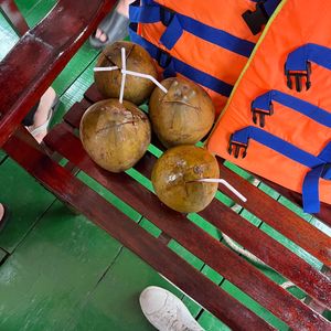 移動中のバスでミネラルウオーターが配られ、帰りの船の移動中には生ココナッツジュースが用意されてました。