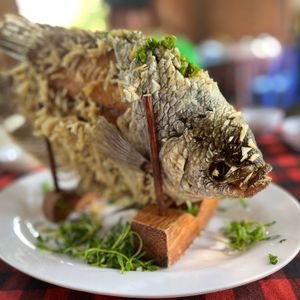 縦盛り付けのエレファントフィッシュに揚げボール?都会では高い値段のものを食し。