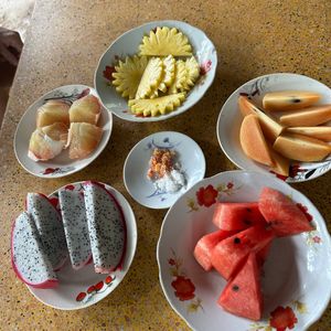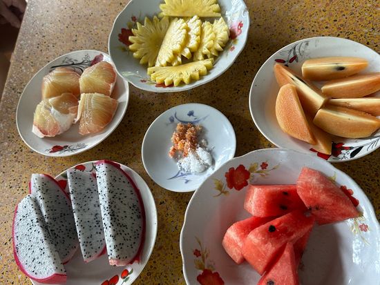 歌に歓迎されながら上品な甘さの柑橘類、ランブータン、パイナップルは塩をつけ頂き、スイカも甘く、パパイヤ、ドラゴンフルーツとお腹いっぱい。