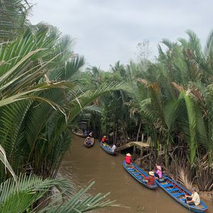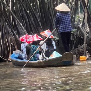 メコン川までホーチミン市内から思ったより遠かっです。4人乗り位のカヌーに乗って川をまわる雰囲気は、ジャングルクルーズみたいでした。道中で、はちみつ販売や蛇との写真などあります。