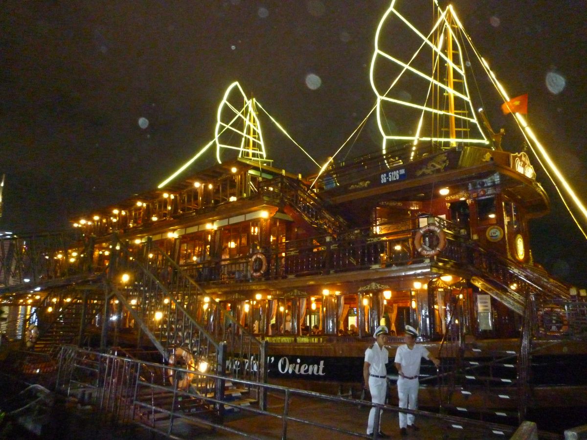 嫁と二人で参加。シクロなしプラン。すべて予定時間どおりでした。現地スタッフも親切丁寧です。窓側の二人用テーブルで予約されており、涼しい川風?と夜景を堪能できました。食事内容も好き嫌いが多い自分でも十分対応できました。屋外デッキでは喫煙もできます。