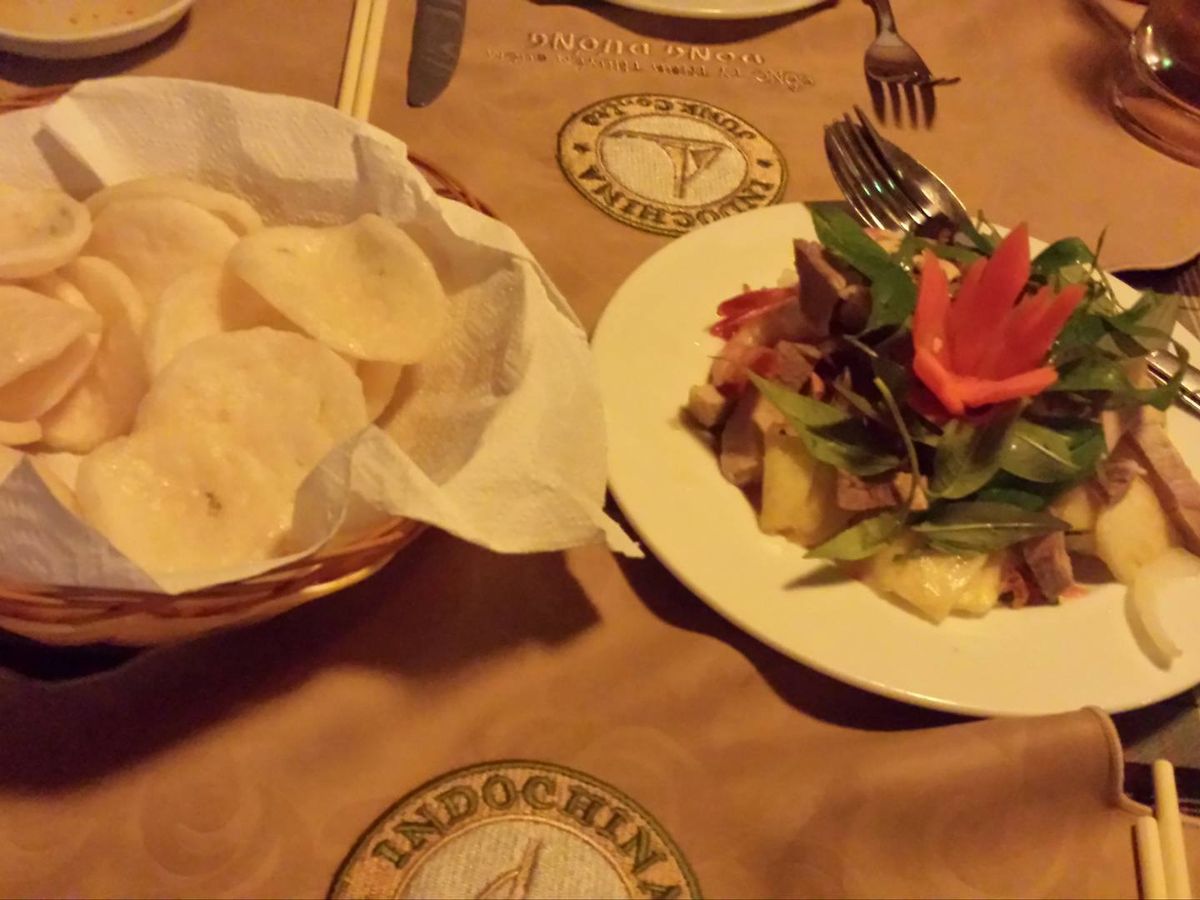 クルーズは大きな船ではありませんでしたが、窓側で心地よい夜風に吹かれながら頂くベトナム料理はゆっくりと時間をかけて食べるのでお腹いっぱいになりました。 私は家内と参加した50歳代の者ですが、正直なところ食べきれなかったです。 簡単なあいさつ程度の英語が出来れば非常に楽しい充実したツアーなのでは無いでしょうか?