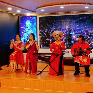 船員の方々(その内の一人:ベトナム大学の学生アルバイト)がとても親切で、料理(バイキング)もおいしく、屋上のデッキで数十名の観光客とサイゴン川の風に吹かれ、優雅な気分に。後半は舞台でパンチのきいた歌と演奏にほとんどの人が共鳴し、一緒に歌ったり、ダンスに興じたりとても楽しかった。