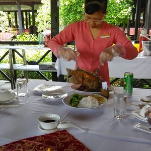 現地の人が住んでいるメコン川中洲へ向かい、蜂蜜、ココナッツ作りを見学、現地の人の歓迎の歌も披露され、手漕ぎボートに乗り、帰りのボート乗り場へ。蜂蜜、ココナッツはお土産で買えます。歌、手漕ぎボートの人にはチップあげて、昼食は20分離れたレストランへ。天皇陛下も以前来られたそうです。洒落たレストランでした。冷房付きの部屋で飲み物別。