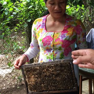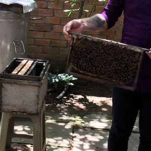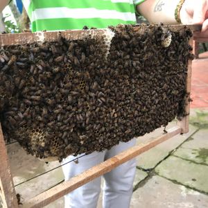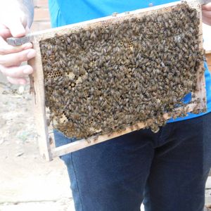 巣箱からスノコ板を取り出すとハチがいっぱい。そして指で押すとはちみつが出てきます。この集めたばかりのはちみつを食べる(なめる)体験ができます。ちょっと酸味がある甘い味です。