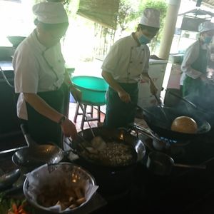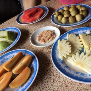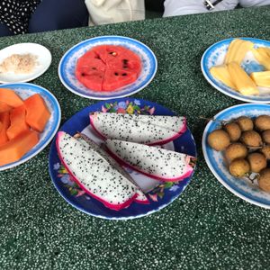 ”象耳魚”を揚げたもの(春巻きを作ってくれます)、お餅のようなもの、フォー(甘め薄味)、プリン等が出ます。