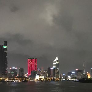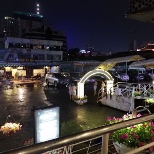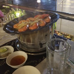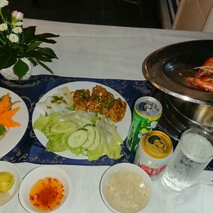 カニスープ、エビと豚肉入り野菜鍋、肉巻き、スイカとパイナップル等、コース料理のような内容です。ドリンクは別料金。私たちはスイカジュース22,000ドンを頼みました。高層ビルのライトアップ等、綺麗な夜景が楽しめます。