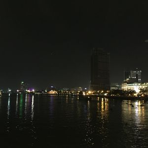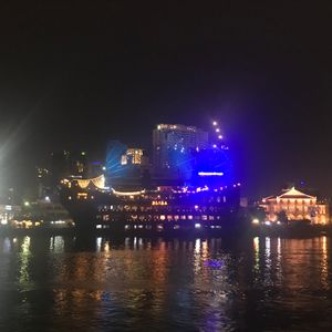 クルージングはイマイチでした。ネオンきらめく方向とは逆に進み、荷物を積み込みする船ばかりを見ました。夜景は遠目に見えます。