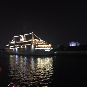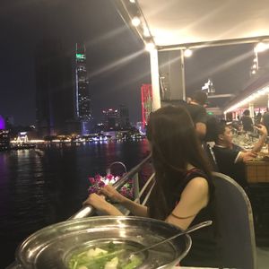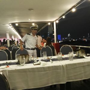 クルーズは夜風が気持ちよかったです。見晴らしのよい全員同じテーブルを用意してもらってありました。口コミでは料理がいまいちと書かれていましたが、種類も豊富でとくに鍋が美味しかったです。ドリンクの提供が遅いので、テーブルについたらすぐにオーダーする方がいいと思います。