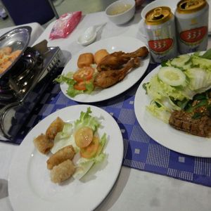 海鮮スープ・揚げ春巻き・大根を牛肉で巻いたもの(中少し赤いです。)・フライドチキン・揚げパン