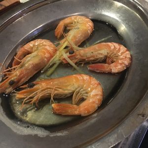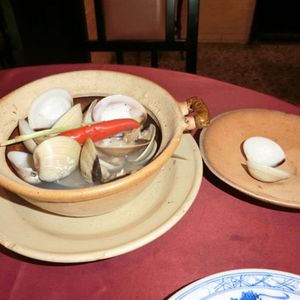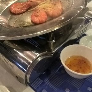食事ですが、蒸したものを凍らせた海老を生姜入りの水を張った皿を直接温めたもの・