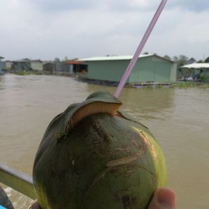 ここで25人乗りぐらいの船に乗りメコン川を渡り小島?のようなところへ。そこでジャスミン茶にはちみつを入れた温かい飲み物とお菓子をいただき、お目当のメコン川デルタクルーズへ。
