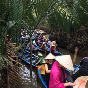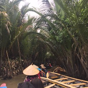メコン川の川下りはこんな狭い幅を行き来するのかと驚くほど船が交差しますが、バランスをとりながら進んでいくのはとても楽しいです。終わると、船をこいでくれたおばさんにチップを要求されますが、妥当な金額が分かりませんでした。。。