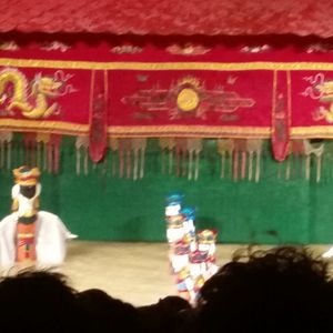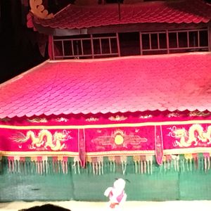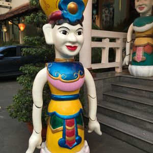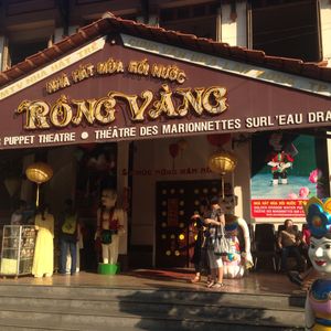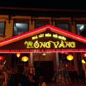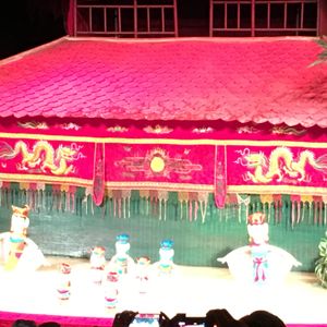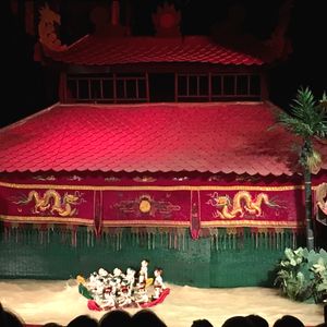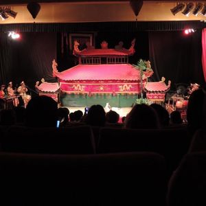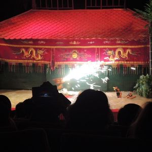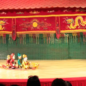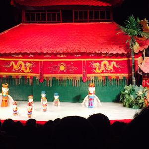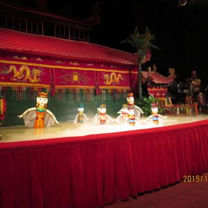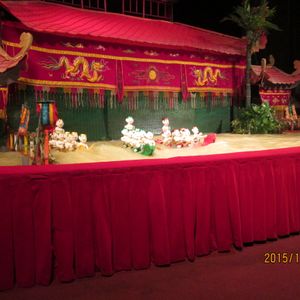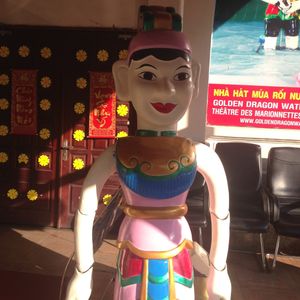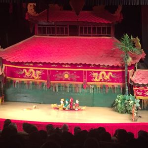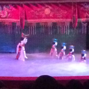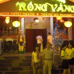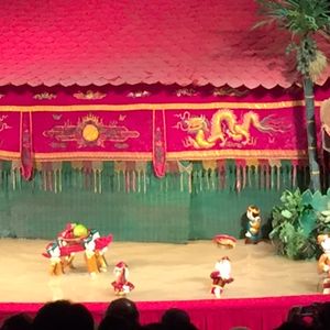 予定のPM6時にガイドさんが迎えに来てくれました。最初は私達2人だけでしたが、途中でもう一組ピックアップして水上人形劇場に到着しました。劇場前はすでに人がいっぱいでした。席は決まっていたようで、私たち中ほどの左端の席でした。また席の右側に大きな柱があり劇が少し見にくく残念な席でした。人形劇の言葉はわからないものの、人形のコミカルな動きや、生の音楽や歌声がとても良かったと思います。