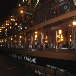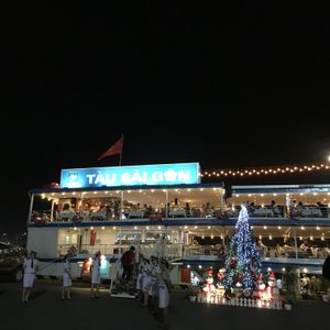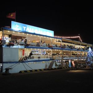 ディナークルーズは、船が時期により変わるのでしょうか? インドシナ号ではなく、サイゴン号でした。エビを中心とした料理で、カセットコンロも用意され加熱なので安心して食べられます。メコン川沿いの電飾夜景は1箇所程度(写真)で後は暗く寂しい、非常にゆっくりと1時間のクルーズです。バンコクのディナークルーズを経験された方は多分もの足りないでしょうか。VELTRAさんの40ドルなら良いですが、他サイトの値段ではCP不満でるのでは?と思いました。