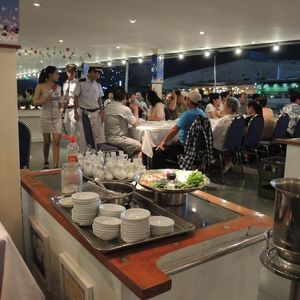 ディナークルーズは、船内が両サイドと真ん中の3つに分かれてるうち、ツアー客のテーブルは真ん中だったため、景色が見づらかったです。でも後ろのデッキに行けば喫煙所とトイレしかないせいか、人がほとんどいなくて、夜景を楽しむことができました。料理はあまり期待していなかったのですが、結構盛りだくさんで美味しかったです。