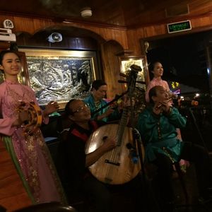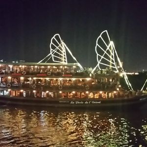 次に、ディナークルーズのみ参加の方のホテルへお迎えに寄ってから船に乗り込みます。少し手違いがあった様でホテル前で待たされましたが。クルーズの船はかなり大きい船でびっくりしました。乗り込んで飲み物を注文し、すぐさま料理が運ばれて来ます。出港してもほとんど揺れも少なく安心して食事出来ます。料理はベトナムの名物がざっと出てくる感じです。鍋もありベトナム初日として良かったかと思います。席がステージから一番離れた場所だったので、生演奏やダンスもありましたがBGM状態でした。1時間ちょっとで食事は少し慌ただしかったですが、夜景も綺麗で、参加出来て良かったです。ディナークルーズ、と聞くとカップルのイメージがありますが、とっても賑やかなカジュアルなツアーでファミリーが多かったです。
