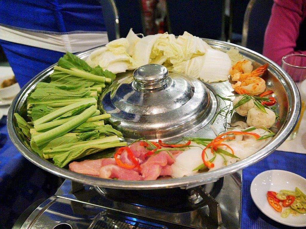 料理は、スープから始まり、エビ、鶏肉、お鍋、〆の麺とお腹いっぱいになりました。