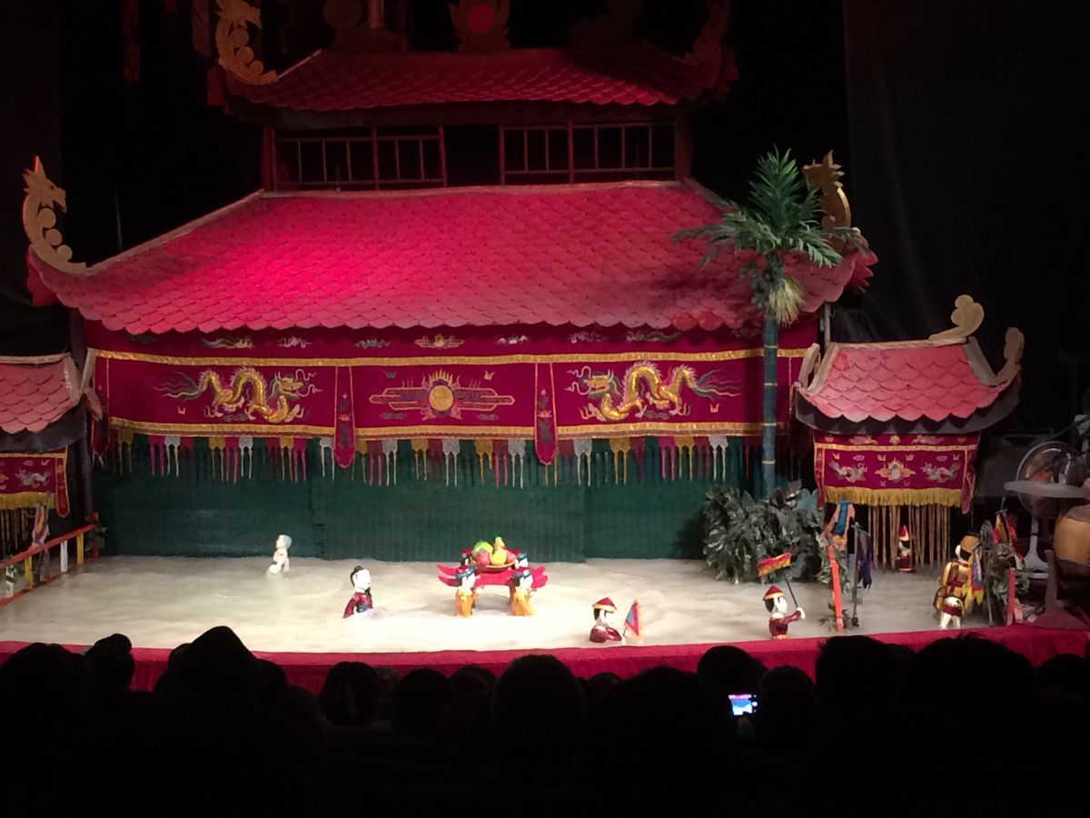 劇場に着いて、さっそく水上人形劇を観ました。劇場は広かったです!映画館のような造りの劇場になっていて、前の方に水のはった池の様な所があり、周りに楽器を演奏する方達が居ました。まず最初に楽器演奏から始まり、みんなで掛け声をしながら演奏していました。