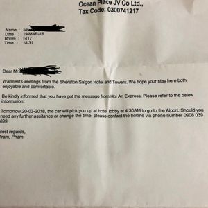 タンソンニャット空港到着が、大幅に遅れたが、出口近くでネームプレートを持って待っていてくれてほっとしました、帰りの空港へのピックアップについても時間通りにホテルに迎えに来てくれて良かったです、ただ少し運転が荒っぽかったと思いました。