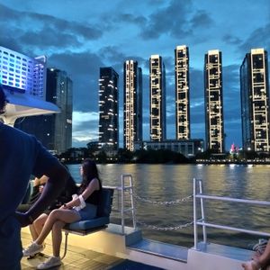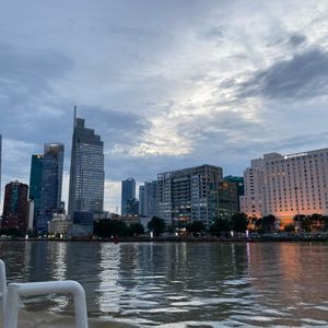 まず、ガイドさんと17時40分頃1区のホテルロビー待ち合わせで約10分後にはサイゴン川の乗船場所に到着。近隣道路は一方通行も多く渋滞状況によっては歩いたほうが早いこともあるようですが、この日はほぼ待ち時間なしで(ホテルから送迎付きで)ガイドさんも一緒に乗船してくれるので安心です。日中の暑さとは異なり、ジメジメした湿気を感じることなく夜風が心地良い45分のクルーズ。船はほぼ揺れず、冷たいココナッツジュースや船上での生演奏のサービスありで2階の特等席から観光としてホーチミンの夜景を楽しむのにちょうど良いです。