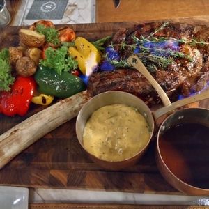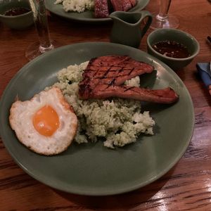 前菜として3種盛り合わせ、メインのポークチョップと目玉焼き、