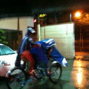 まだ、雨が強い中、シクロを劇場前まで寄せてくださり、雨よけのフード越しですが、シクロ搭乗体験をさせていただきました・・・わーい!!