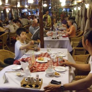 ディナークルーズは、いくつかある船のなかでも一番豪華な、趣味のいい船でした。ランタンがたくさん灯り、木造の素敵な3階建てです。料理もいいですし、給仕もよかったです。一番上の階は、ゆったりくつろげるオープンエアになっていました。食後は自由に動き回れましたよ。