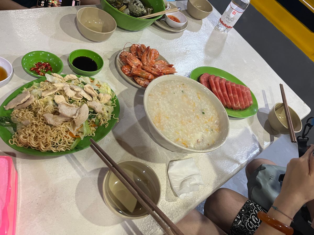 船上で夕食を食べます。メニューはチキン焼きそば、シーフードのお粥、茹でた海老、スイカでした。ツアーの最初にミネラルウォーターを1人1本もらえますが、冷たいビールやジュースを船上で買うことができます。また活きている貝類を1キロ30万ドン(約1,800円)で買って、BBQにしてもらうことも可能です。