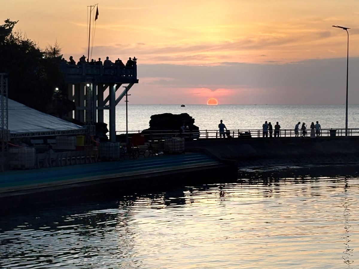 大型バスに乗り換えて、島の南部のSao Beachへ。風光明媚なビーチで、どこを撮っても絵になります。ここから小船に乗って、沖に停めてある大型船に乗り換えます。小船に乗る際に濡れる可能性があるので、履き物はサンダルが良いと思います。大型船は3階建てで、揺れが少なく快適。2階にハートの形をしたSNS映えしそうなベンチがありました。しばし船上からサンセットを楽しみます。