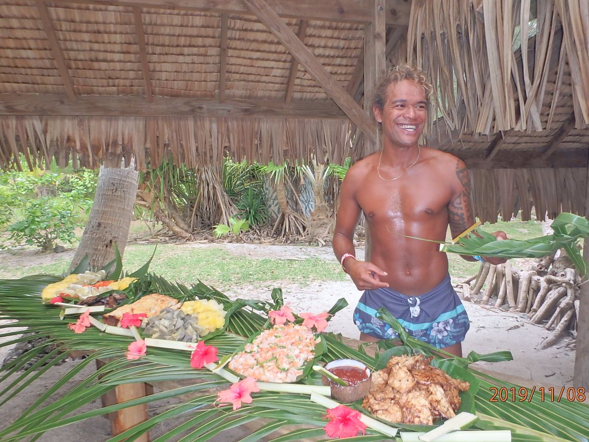 ランチはアウトドアの簡単なスタイルですがチャモロBBQ的なものをいただき、デザートまで。