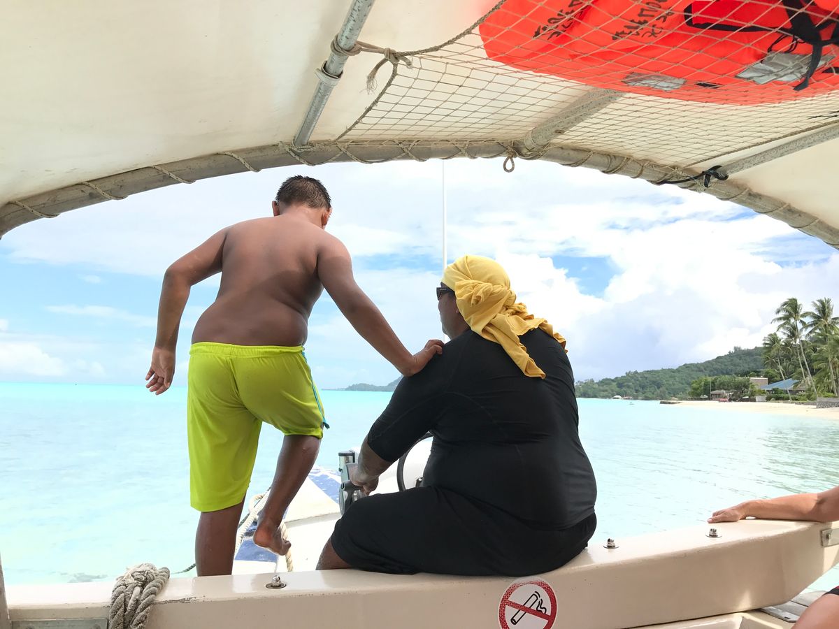 ツアー集合場所:滞在ホテルのシャトル(ボラボラ島、自費)→バイタペのツアーオフィスまで自力。その後、マティラビーチまで送迎あり。