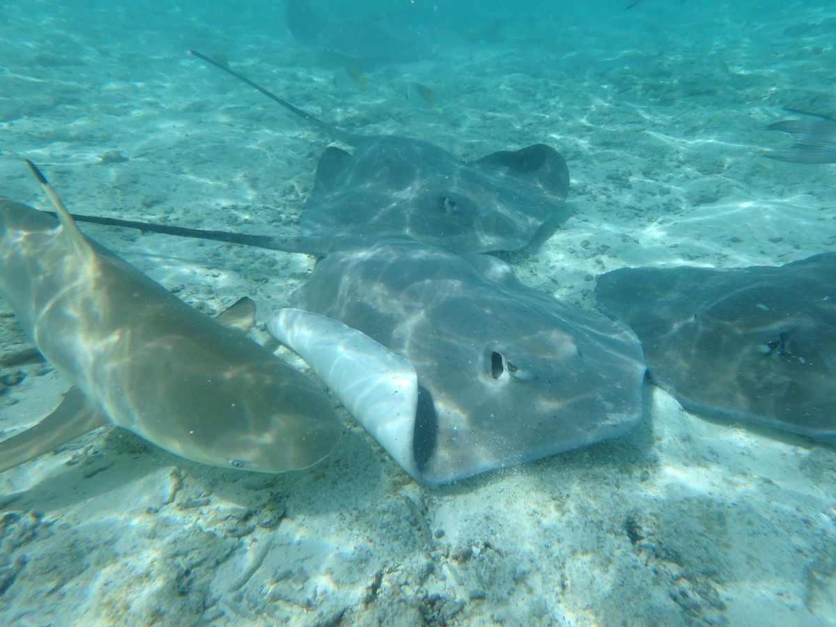 1.エイ、サメの集まるスポットでガイドが餌付けしている周りをシュノーケリング。エイやサメが自分達の周りを回遊している様は圧巻!他のツアー船も集まる場所でした。