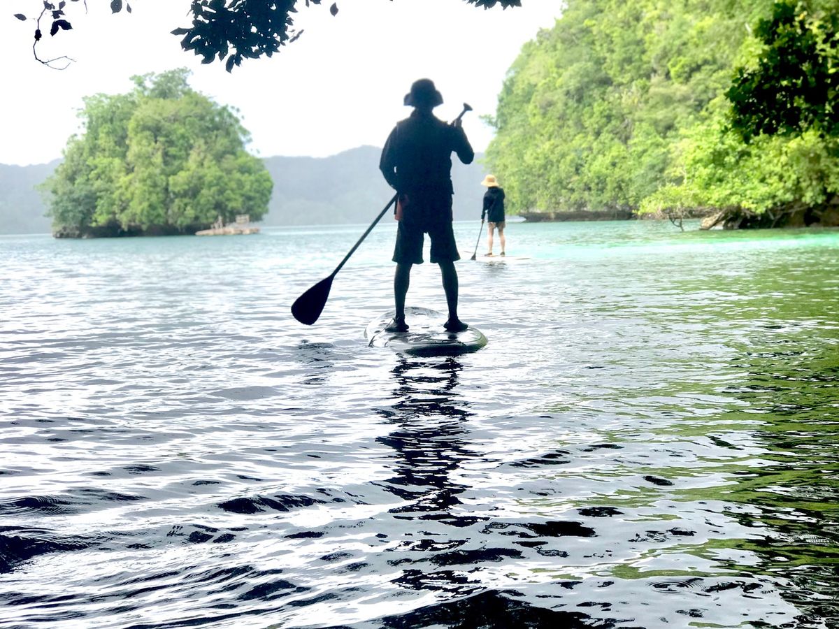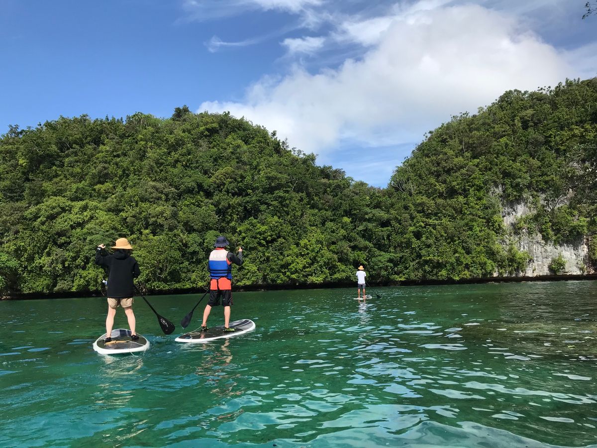 この日は私たち夫婦だけだったので、ガイドのお二人(後で聞いたらパラオの大御所の方!)と楽しくお話しながらSUPに挑戦!