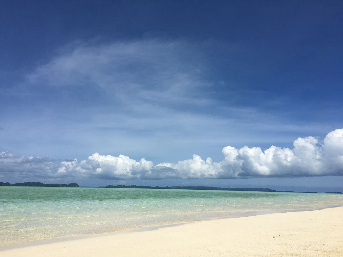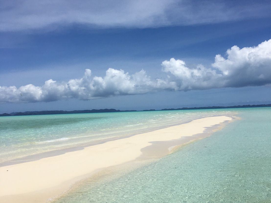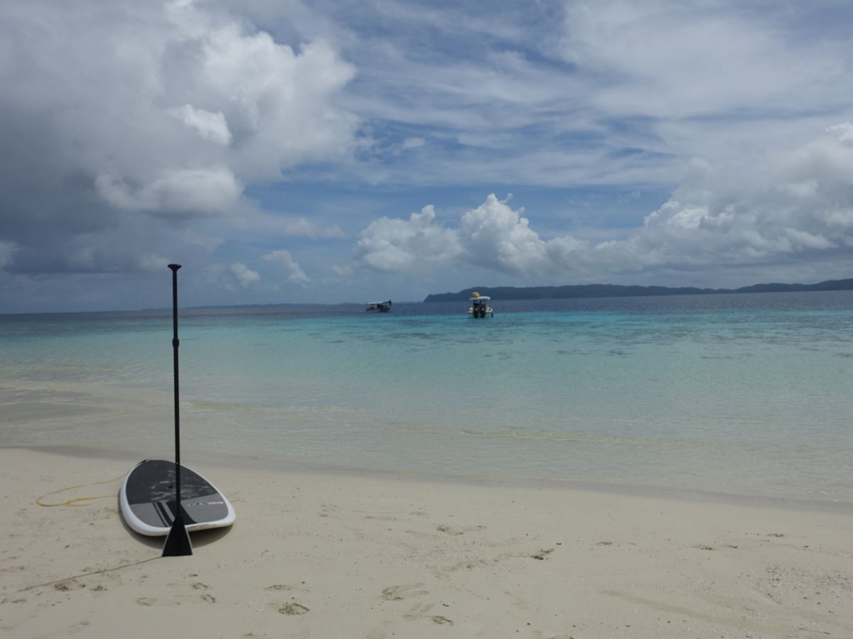 昼食にするといって、海の真ん中で船を止め、海の上にわずかに見える砂浜に上陸すると言われた時にはちょっとびっくりしました。SUPに二人で乗って先に上陸すると、あとから、食料とテーブル付きのビーチパラソルや椅子までもSUPに載せて運んできてくれたのです。まさに、出来立てのヴァージンアイランドに自分たちだけのオープンカフェができたようなものです。360度周りは海で、他に人もおらず最高です。スタッフの人ともパラオの生活などいろいろな話を聞けて、まったりとした時間が過ごせました。