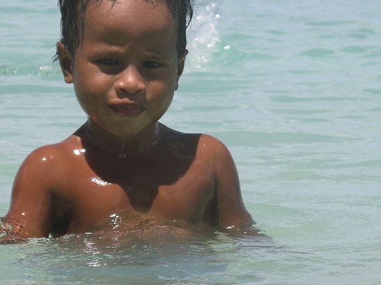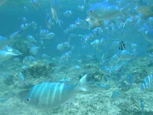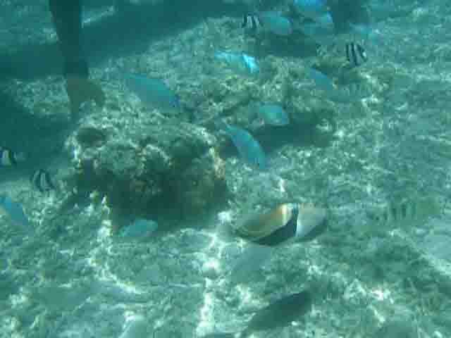 スタッフのかたがくれた、さかなのえさ(たぶん前の人たちの食べ残し^^;;???)をもって海に入ると、さかながたくさん寄ってきて、こどもはよろこんでいました。