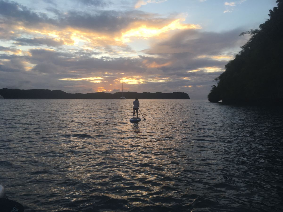 サンセットに参加しました!天気が悪かったのですが、星も綺麗で初めて夜光虫をみました☆自分のカメラも持っていけばよかったと少し後悔(@_@)初SUPでしたが、慣れるとすいすい進めて楽しかったです!