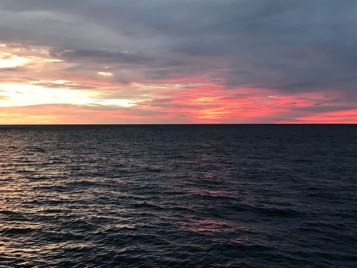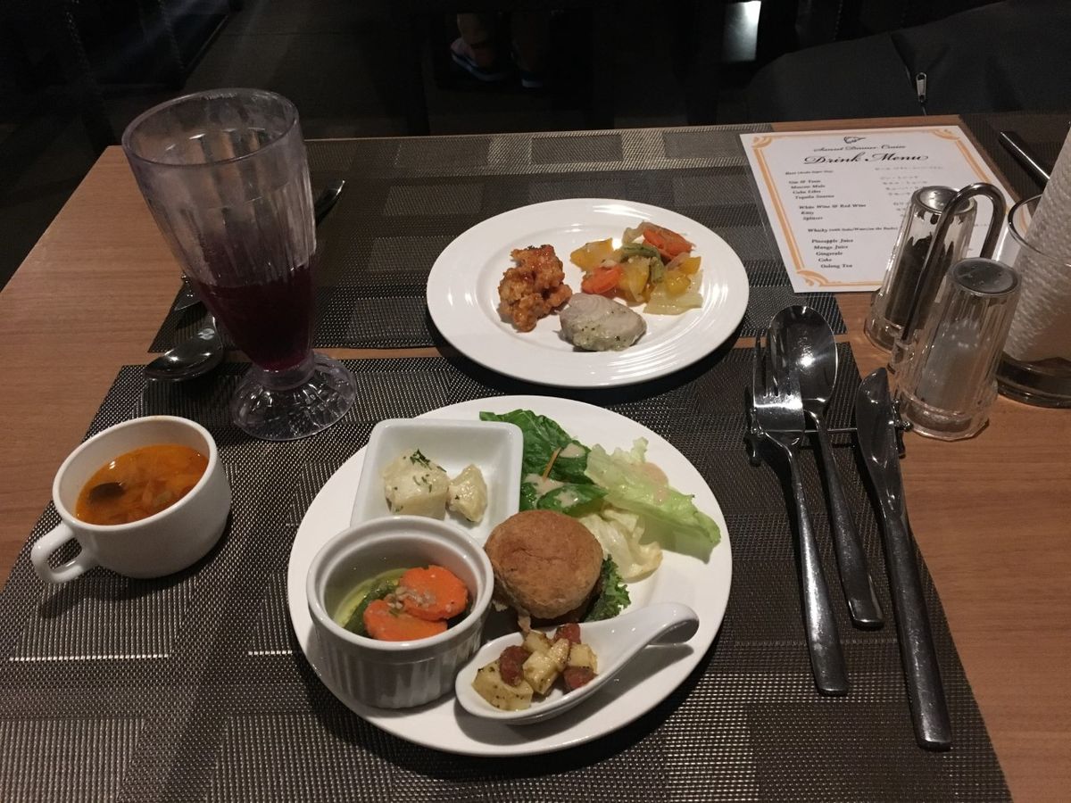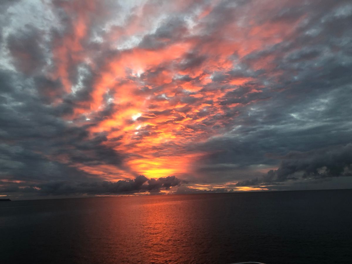 穏やかな港を出港して、だんだんと日が暮れてきました。きれいな空だったのですが、サンセットのタイミングに少し間に合わず夕日自体が見れませんでした。夕焼の空と雲の色はキレイだったのですが、せっかくなら夕日が見たかったです。お料理は船内でのバイキング形式で味もおいしかったです。