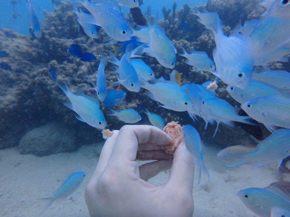 ソーセージを手に持っているといろんなお魚さん達が寄ってきて目の前で食べてくれてこれは本当に感動しました!!